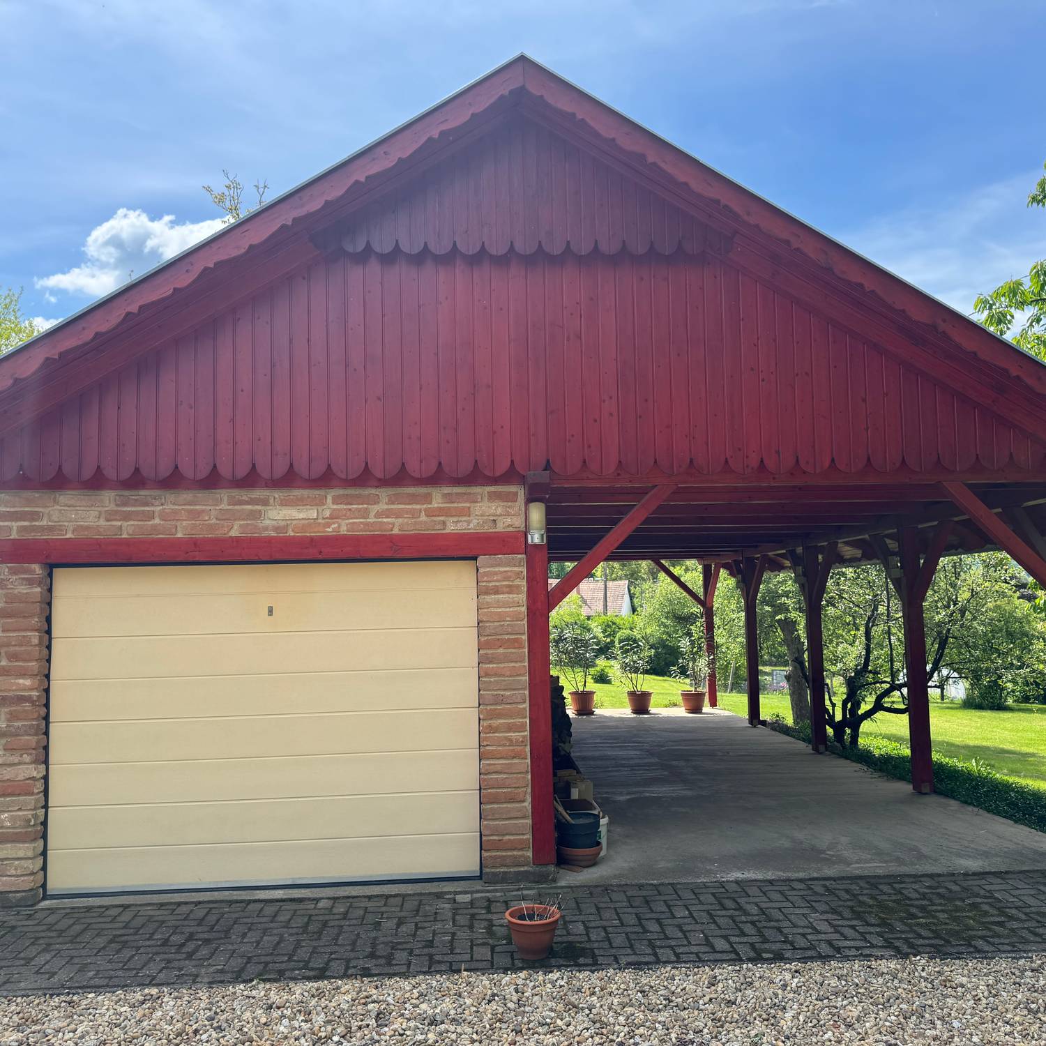 Er is de garage met zeer ruim overdekt terras van ongeveer 70 m2 met zomerkeuken en wijnkelder gebouwd.