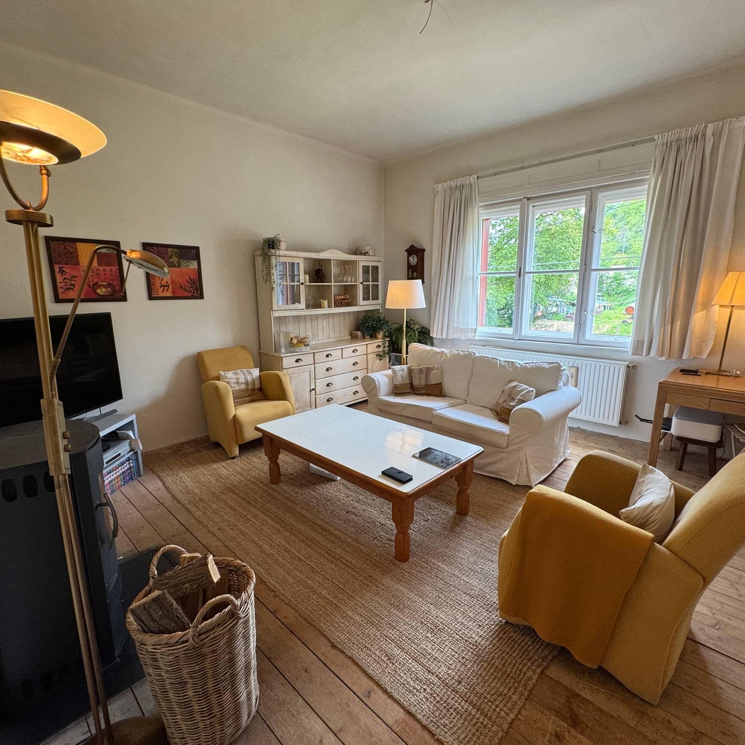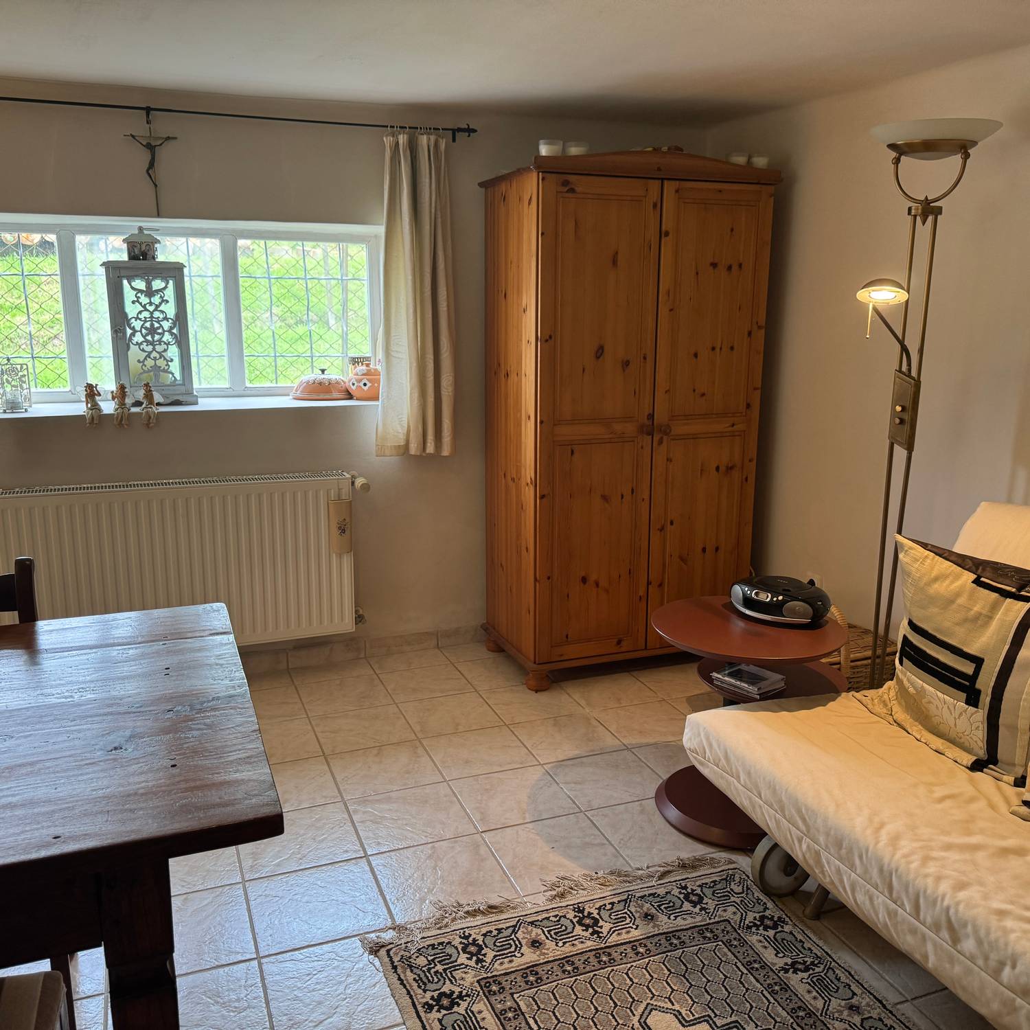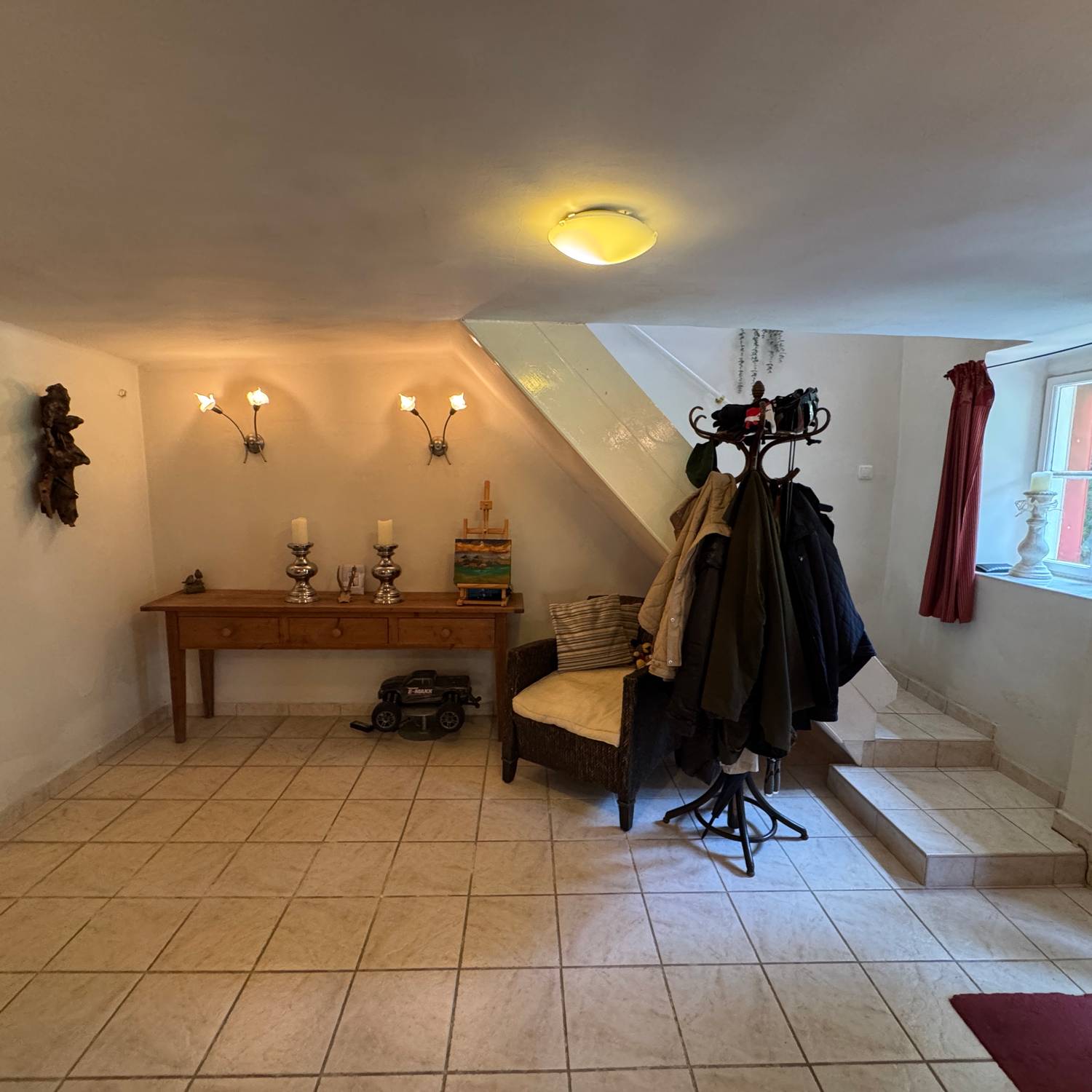 - entree met lage plafonds, slaap/hobbykamer, ruime leefkeuken, badkamer, separaat toilet en een voorraadruimte.